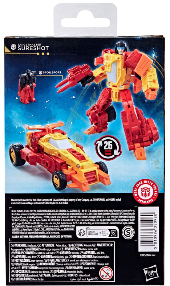 Mukana tulee mini Spoilsport -hahmo, joka muuntuu blaster-aseeksi. Erinomainen liikkuvuus ja kiinnitettävät lisävarusteet tekevät Targetmaster Sureshotista loistavan lisän Transformers-kokoelmaan.