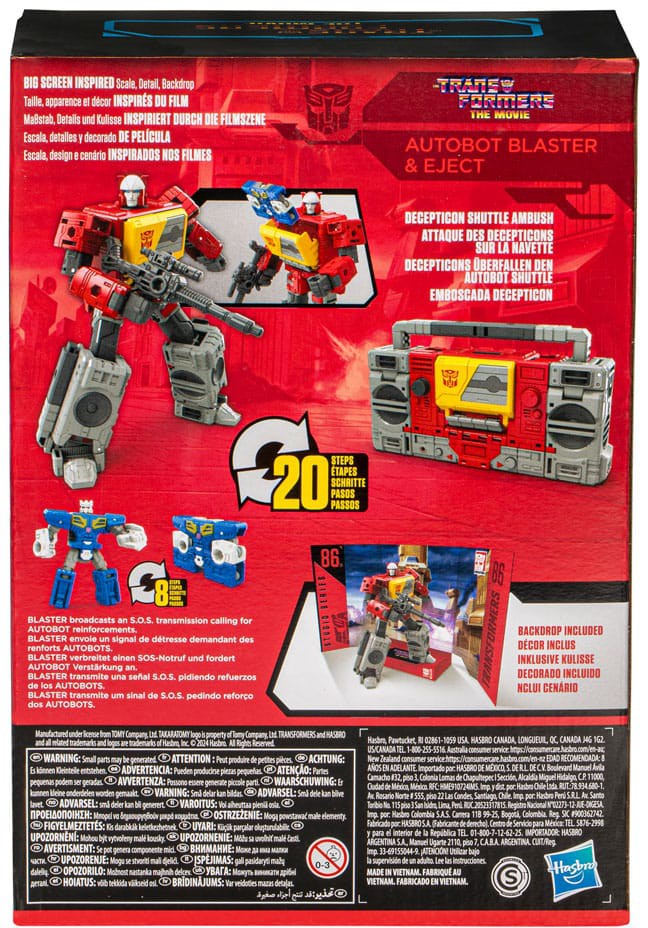 Bring the epic action of the Transformers movies from the big screen into your collection with the Transformers Studio Series Voyager Class Autobot Blaster and Eject action figures, inspired by The Transformers: The Movie! Transformers Studio Series toys are collectible action figures that feature movie-inspired details and accessories. Convert the Autobot Blaster Studio Series Transformers action figure from robot to boombox mode in 20 steps and convert the Eject figure to mini-cassette mode in 8 steps. Pose the figures in the included Decepticon Shuttle Ambush removable backdrop scene. Look for more Transformers Studio Series collectible figures to build a movie-inspired collection!