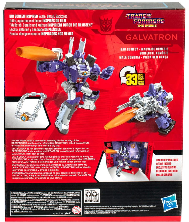 Bring the epic action of the Transformers movies from the big screen into your collection with the Transformers Studio Series Leader Class Galvatron action figure, inspired by The Transformers: The Movie! Transformers Studio Series toys are collectible action figures that feature movie-inspired details and accessories. The figure converts from robot to galactic cannon mode in 33 steps and features articulated head, arms, and legs for awesome action poses. It comes with 3 cannons that attach in both modes and a Matrix of Leadership that can hang around the figure's neck. Look for more Transformers Studio Series collectible figures to build a movie-inspired collection.