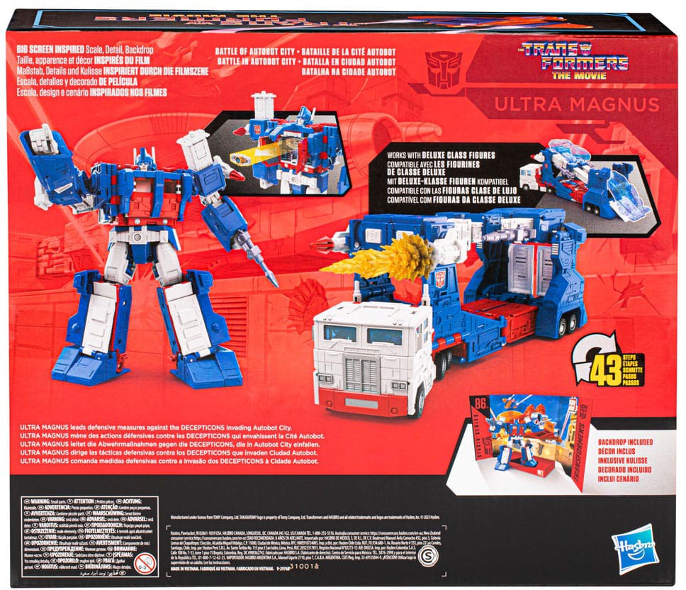 Bring the epic action of the Transformers movies from the big screen into your collection with the Transformers Studio Series Commander Class Ultra Magnus action figure, inspired by The Transformers: The Movie! Ultra Magnus leads defensive measures against the Decepticons invading Autobot City. Transformers Studio Series toys are collectible action figures for 8 year old boys and girls that feature movie-inspired details and accessories. Convert the action figure from robot to semi trailer mode in 43 steps and pose the Ultra Magnus toy in the included Battle of Autobot City removable backdrop scene. Transformers action figures for boys and girls make great gifts!