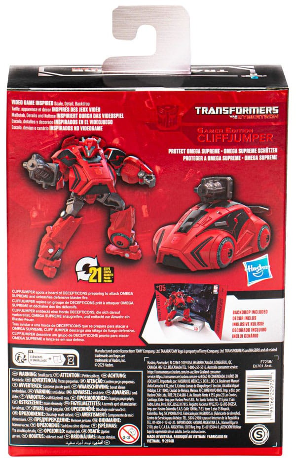 Bring your favorite action-packed moments from the Transformers video games into your collection with the Transformers Studio Series Deluxe Class 05 Gamer Edition Cliffjumper action figure, inspired by the Transformers: War for Cybertron video game! Cliffjumper spots a hoard of Decepticons preparing to attack Omega Supreme and unleashes defensive blaster fire. Transformers Studio Series Gamer Edition toys are collectible action figures for 8 year old boys and girls that feature video game-inspired details and accessories. Convert the action figure from robot to Cybertronian car mode in 21 steps and pose the Cliffjumper toy with the included Protect Omega Supreme removable backdrop scene. Transformers action figures for boys and girls make great gifts!
