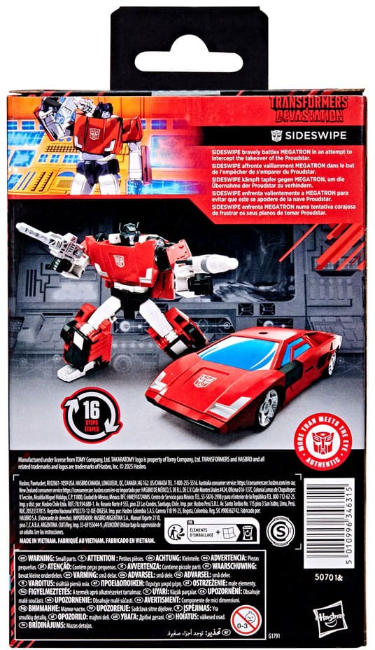Koe Transformers Devastation -videopelin eeppinen toiminta Transformers Studio Series Sideswipe -lelun avulla! MTMTE-kokoelmaan kuuluva 11 cm:n (4,5") hahmo muuntuu robottitoimintahahmosta autoleluksi 16 askeleessa. Pelistä inspiroituneilla yksityiskohdilla, monimutkaisella poseerausmahdollisuudella ja kiinnitettävillä lisävarusteilla, kuten olkaraketilla ja räjäyttimellä, tämä Sideswipe-toimintafiguuri on loistava lisä mihin tahansa kokoelmaan.