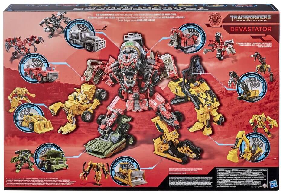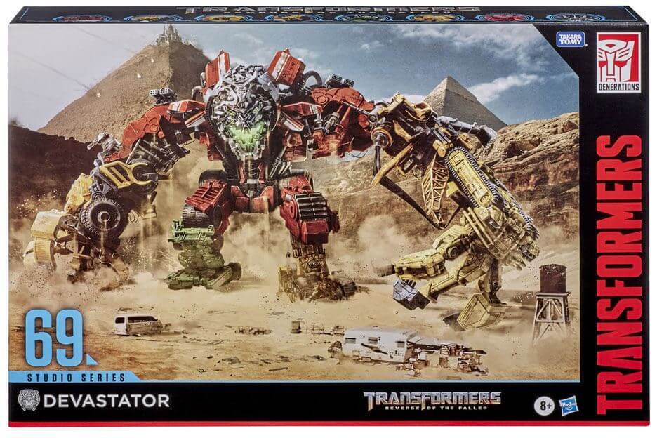 This Studio Series 69 Devastator 8-pack features all 8 collectible Constructicon figures inspired by Transformers: Revenge of the Fallen with additional movie-inspired deco that did not appear in the original releases. The figures combine to form the Devastator figure in 11 steps. Figures also convert between robot and construction vehicle modes. Remove extra-large backdrop to showcase the massive Devastator in the Pyramid Desert Battle scene. Includes 3 detailed accessory.