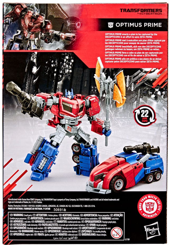 Koe Transformers: War for Cybertronin eeppinen toiminta Transformers Studio Series Optimus Prime -lelun avulla! MTMTE-kokoelmaan kuuluva 16,5 cm:n (6,5 tuuman) hahmo muuntuu robottitoimintahahmosta Cybertronin kuorma-automoodiin 22 askeleella. Tämä Optimus Prime -toimintafiguuri on loistava lisä mihin tahansa kokoelmaan, sillä siinä on pelin innoittamia yksityiskohtia, kuten taistelupukuinen sisustus, monimutkainen poseerauskyky sekä ioniräjäyttäjä, Energon-kirves ja Matrix of Leadership -liitettäviä lisävarusteita.