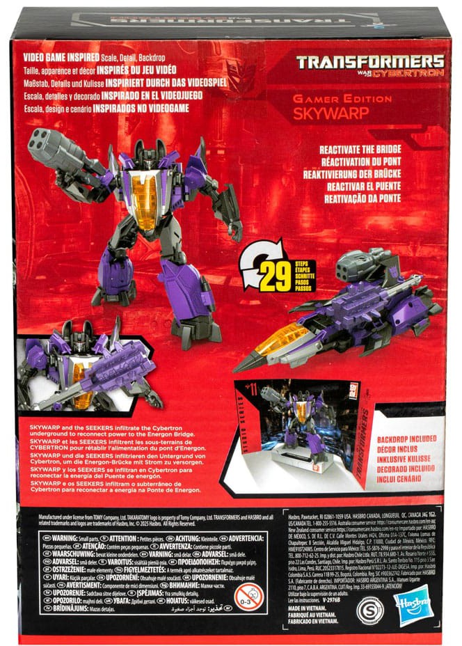 Bring the epic action from the Transformers video games into your collection with the Transformers Studio Series Voyager Class 11 Gamer Edition Skywarp action figure, inspired by the Transformers: War for Cybertron video game! Transformers Studio Series Gamer Edition toys are collectible action figures that feature video game-inspired details and accessories. Convert the Studio Series Transformers action figure from robot to jet mode in 29 steps and pose the Skywarp toy in the included Reactivate the Bridge removable backdrop scene. Look for more Transformers Studio Series Gamer Edition collectible figures to build a video game-inspired collection.