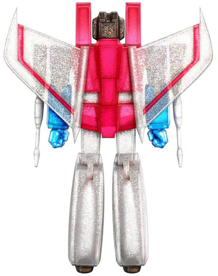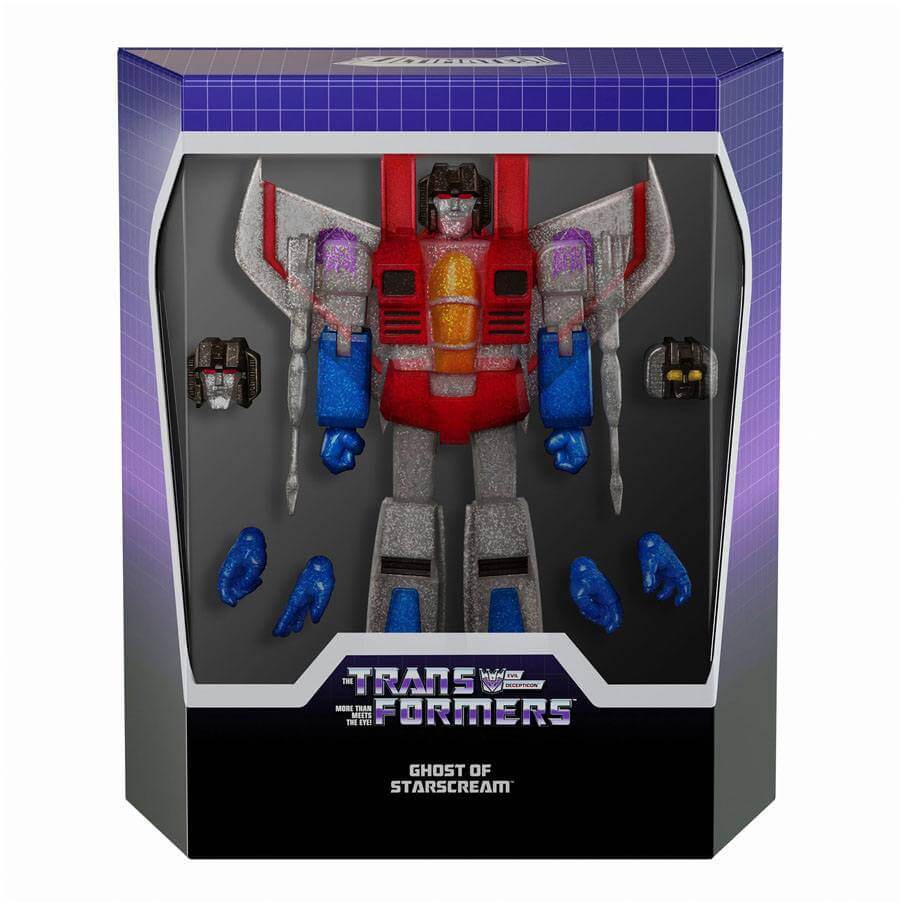 Based on the episode "Starscream's Ghost" from the original G1 cartoon, Starscream returns as a sparkling robo-ghost after being blasted into oblivion by Galvatron in The Transformers: The Movie. This figure features glitter injected directly into the translucent plastic to achieve this hauntingly