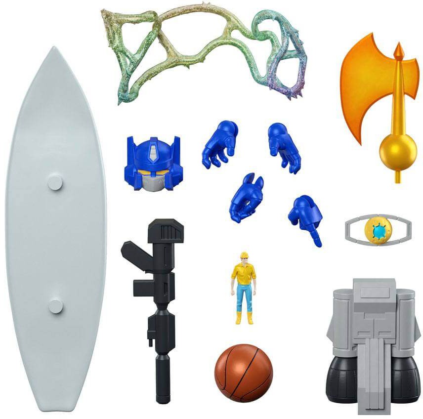 Based on his look from the original G1 cartoon, this 7" highly-articulated deluxe action figure is made-to-order and includes a variety of unique interchangeable parts, like his G1 toy-accurate head, his jetpack, a surfboard, and a basketball! Recreate Optimus Prime's basketball game from