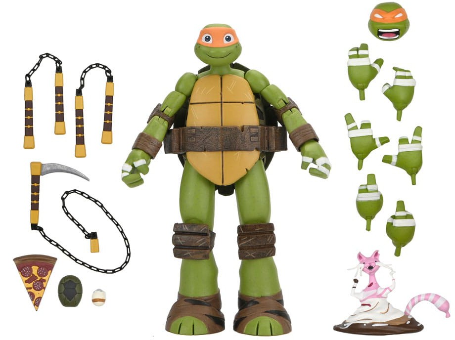 He includes an array of episode-specific accessories: interchangeable heads and hands, nunchucks and kusarigama, pizza slice, smoke bomb, Turtlecom, and fan-favorite Ice Cream Kitty.