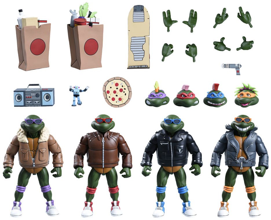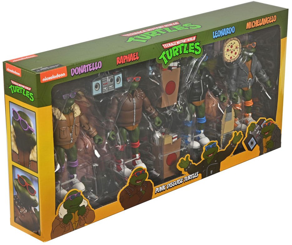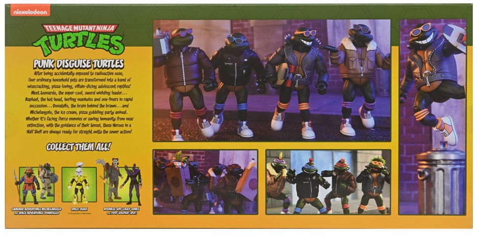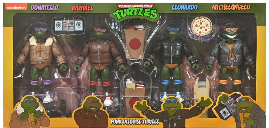 Based on the classic 1980s Teenage Mutant Ninja Turtles cartoon series! After being accidentally exposed to radioactive ooze, four ordinary household pets are transformed into a band of wisecracking, pizza-loving, villain-dicing adolescent reptiles! The Heroes in a Half Shell are ready to rock in this radical Punk Turtles 4-pack! These 7-inch scale action figures of Leonardo, Raphael, Michelangelo, and Donatello come loaded with all-new, episode-specific accessories! Presented in collector-friendly window box packaging.