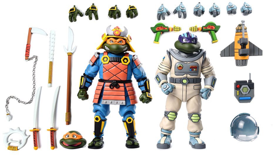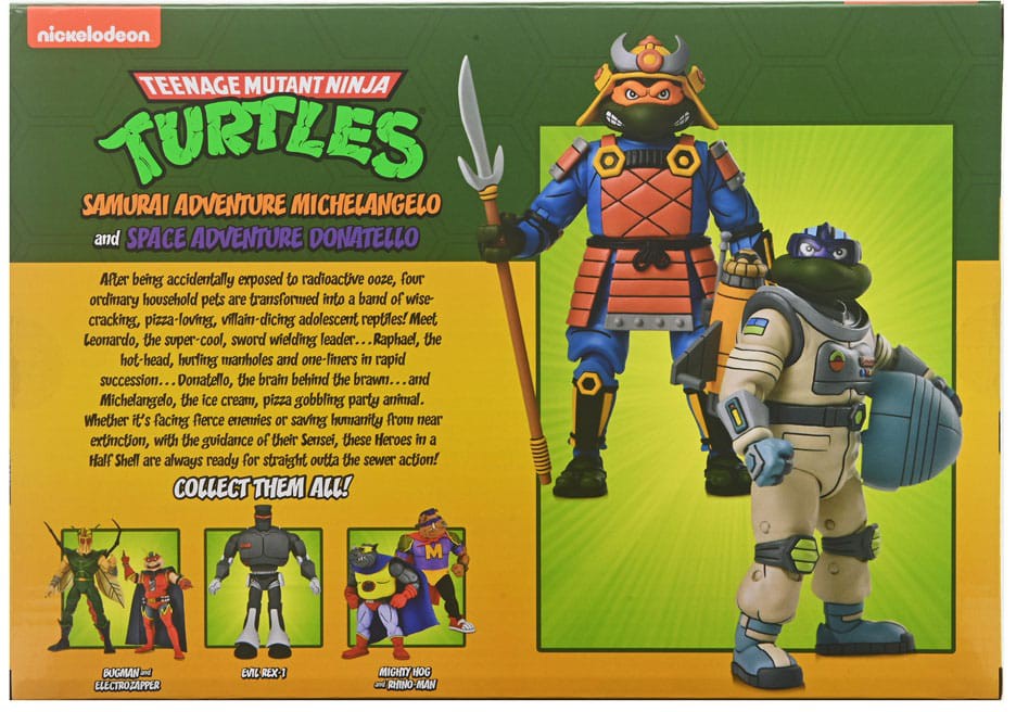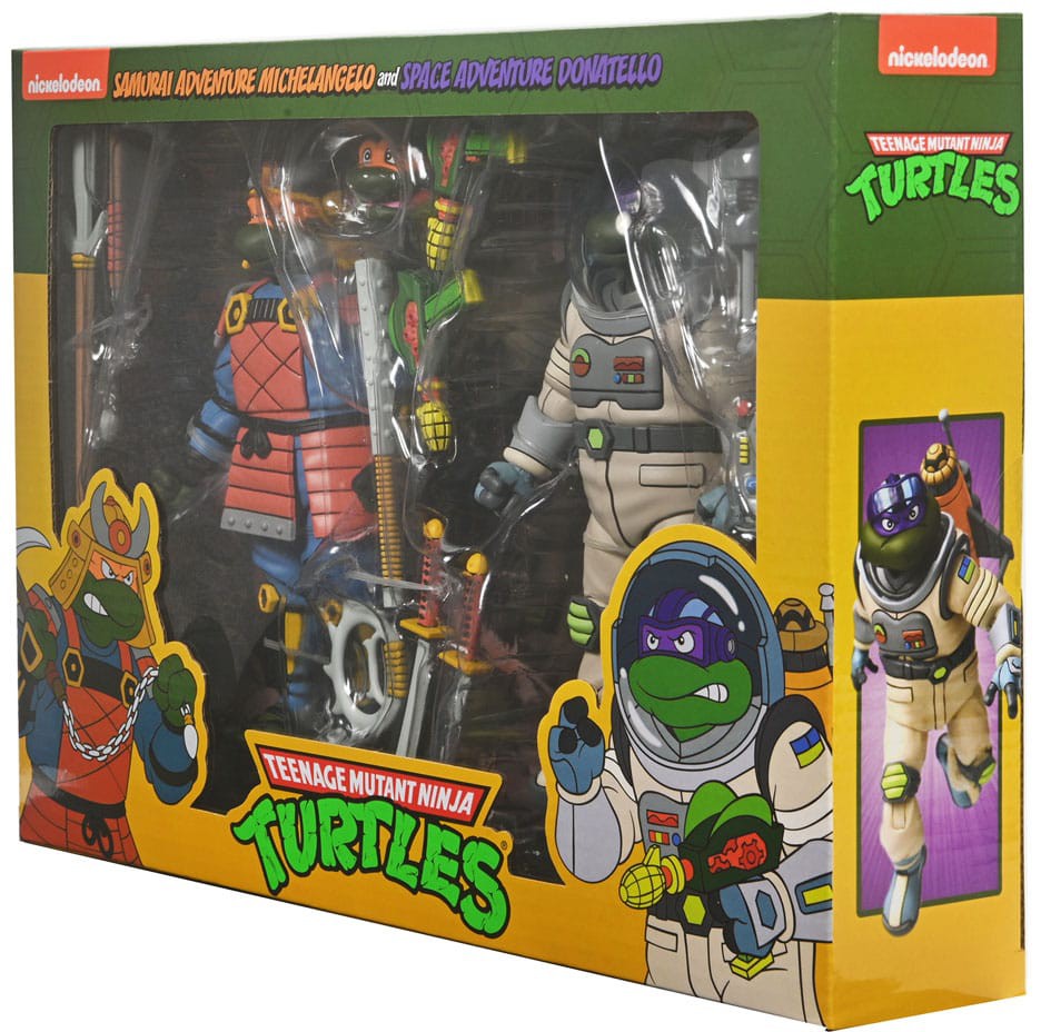 Take your Turtles out of the sewer and into the far reaches of space... or back to feudal Japan! In the style of the classic 1980s Teenage Mutant Ninja Turtles cartoon series, NECA has designed imaginative new outfits for Michelangelo and Donatello that let you take them on adventures in a parallel pizza-verse! This 7" scale 2-pack features Space Adventure Donatello and Samurai Michelangelo. Donatello comes with removable helmet, goggles, interchangeable hands, attachable backpack, rocket, and two cosmic corn blasters. Michelangelo includes interchangeable expressions, kabuto helmet, interchangeable hands, spear, kusarigama, tetsubo, chakram, and two katanas. Heads are compatible with NECA's TMNT Turtles in Disguise figures to customize your heroes in a half shell while waiting for your pizza delivery. Comes in the classic cartoon 2-pack style packaging you all know and love.