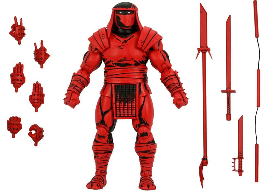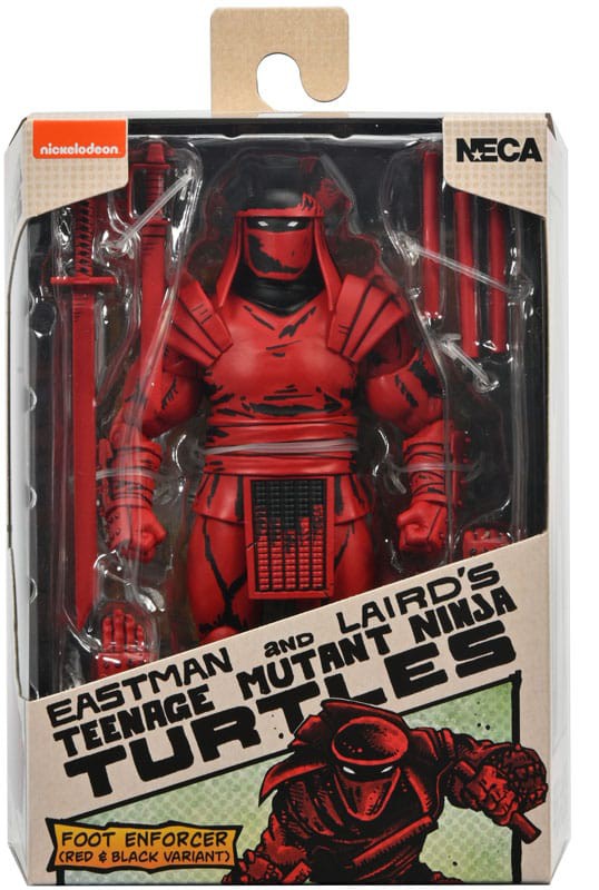 Tässä Foot Enforcer -toimintafiguurissa on jännittävä uusi punainen ja musta värimaailma. Mukana on kolmiosainen sauva, ninjato, perhosmiekka, naginata ja neljä sarjaa vaihdettavia käsiä. Tämä NECA-keräilyhahmo toimitetaan erityisessä sarjakuva-aiheisessa ikkunalaatikossa, jonka on kuvittanut Kevin Eastman.