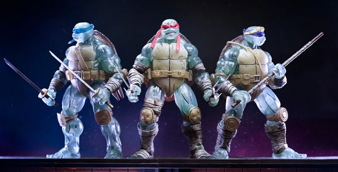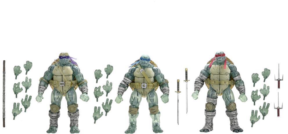 From the Teenage Mutant Ninja Turtles comic book series, The Last Ronin! Even though Michelangelo is the sole surviving Turtle in future NYC, Leonardo, Raphael, and Donatello live on in his memory. This Ghost Brothers action figure 3-pack from NECA features the characters commemorated in special spectral translucent plastic. The 7-inch scale figures include their signature weapons and extra hands and come in collector-friendly packaging with original artwork by The Last Ronin artist Ben Bishop.