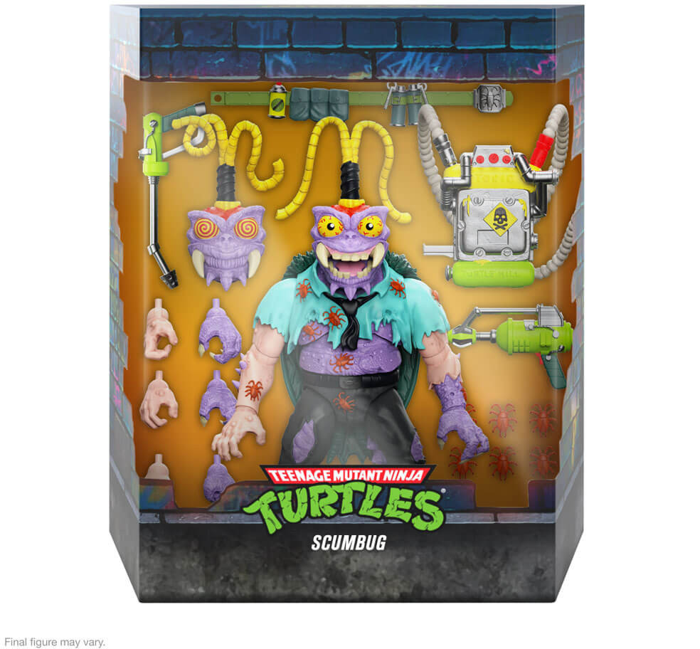 Making a living can be hard, but with a bulletproof shell, a telepathically-controlled insect army, and a backpack full of toxic chemicals, Scumbug is the perfect choice to wipe out Shredder's biggest pests - the Ninja Turtles! This 7" scale Teenage Mutant Ninja Turtles ULTIMATES! figure of Scumbug features multiple interchangeable heads & hands and a variety of accessories including a utility belt, spray guns, cockroaches, and more! Unlike the roach this baddie has mutated from, this Scumbug ULTIMATES! figure won't be around forever, so get your pre-order in before the opportunity is exterminated for good!