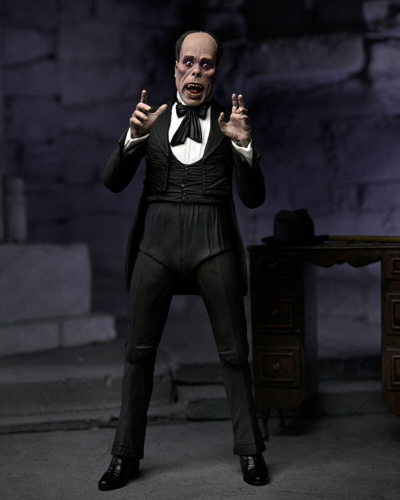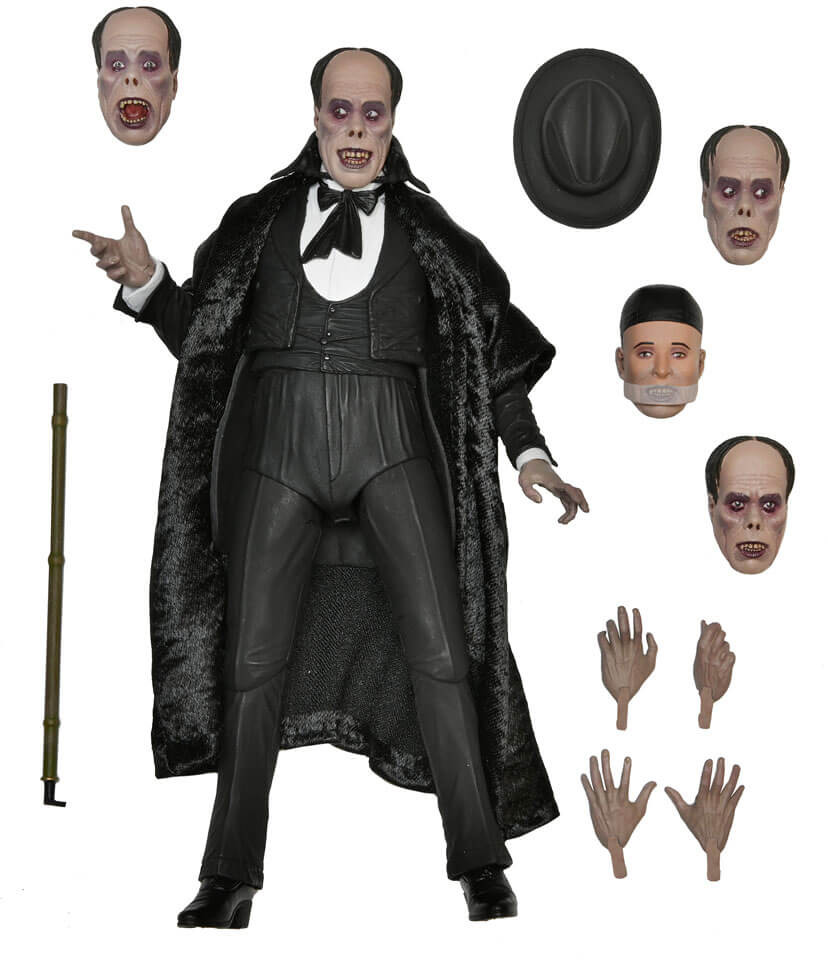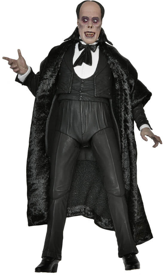 Celebrating more horror legends, NECA is excited to reveal The Phantom of the Opera! Starring Lon Chaney, the 1925 silent movie was famed for the shocking appearance of the Phantom, which Chaney created himself and kept secret until the premiere. Almost a century later, the thriller is still critically acclaimed and was added to the United States National Film Registry in 1988 for its historical and cultural significance. The 7" scale figure captures the Phantom both disguised and unmasked with five interchangeable heads, and also includes fabric cloak, bamboo stick and hat accessories. Display-friendly window box packaging with opening front flap.