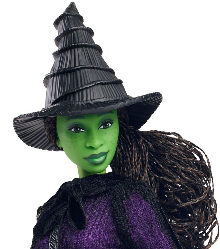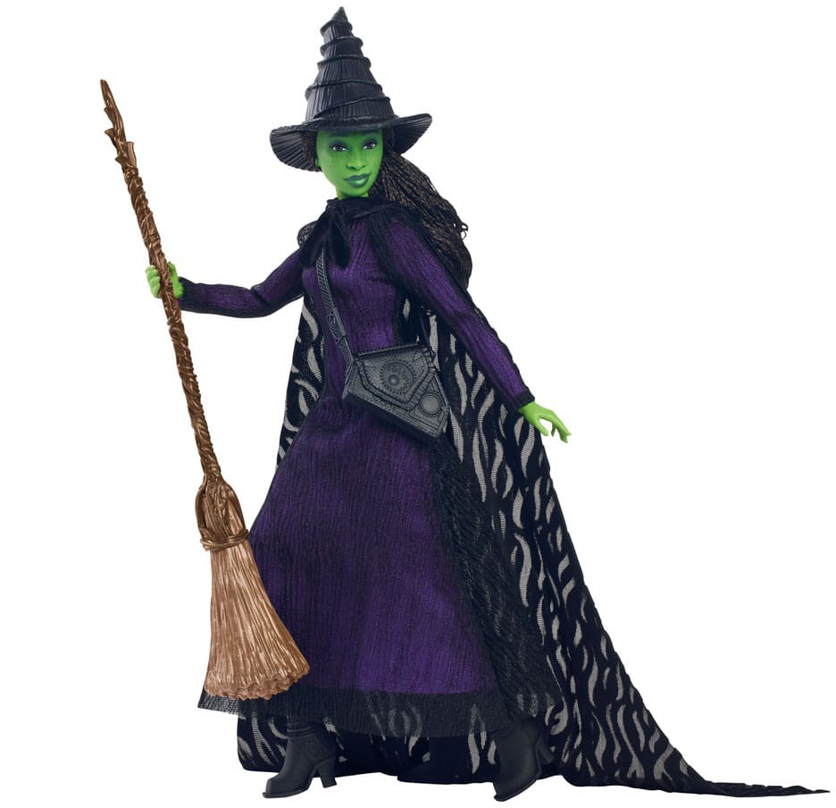 Inspired by the film Wicked from Universal, the deluxe Elphaba fashion doll captures her most magical look from the movie! Elphaba is adorned with a dramatic cape that sweeps over her beautiful sheer black dress with purple undertones and the signature boots in which she traverses the Land of Oz. Capturing a true-to-movie look, the Wicked Witch of the West styles her long braided hair into a low ponytail and has her iconic hat, broom, and satchel. With 11 points of articulation, Elphaba doll can be posed for imaginative storytelling and dynamic display. Doll stand included. Doll cannot stand alone.