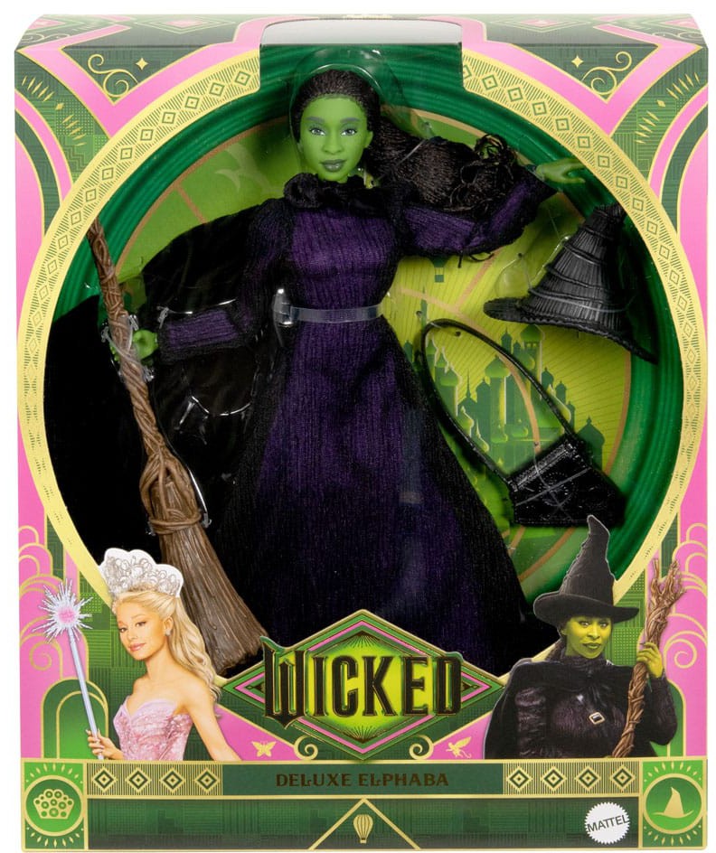 Universalin Wicked-elokuvan innoittama Elphaba-muotinukke on saanut inspiraationsa elokuvan taianomaisimmasta ulkoasusta! Elphaba on koristeltu dramaattisella viitalla, joka pyyhkäisee hänen kauniin mustan mekkonsa yli, jossa on violetti sävy ja hänen tunnusomaiset saappaat, joilla hän matkustaa Ozin maassa. Lännen pahalla noidalla on elokuvan mukainen ulkoasu, ja hänellä on pitkät punotut hiukset matalassa poninhännässä ja hänellä on ikoninen hattu, luuta ja olkalaukku. Elphaba-nukessa on 11 nivelpistettä, ja sen voi poseerata mielikuvituksellista tarinankerrontaa ja dynaamista näyttelyä varten. Mukana nuken jalusta. Nukke ei voi seistä yksinään.