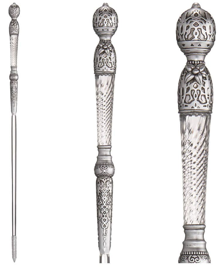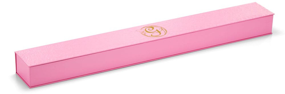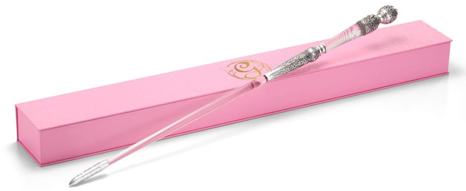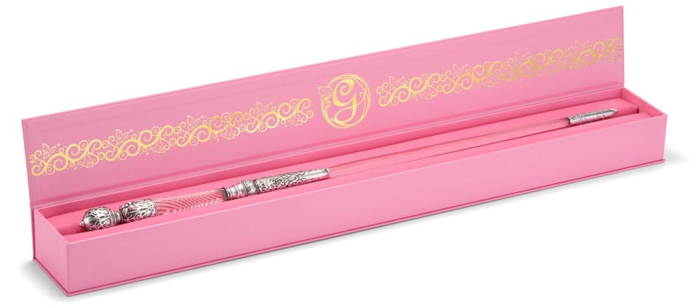 Complete with embossed details and antique silver-coloured deco with a patina finish, this 22" (55,5 cm) prop replica wand comes in a Glinda-pink leatherette collector's box.