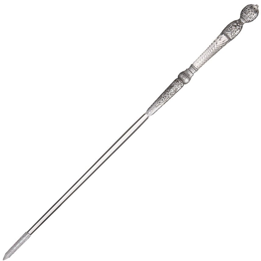 Tämä 55,5 cm (22") pitkä sauvan jäljennös, jossa on kohokuvioidut yksityiskohdat ja antiikkihopeanvärinen koristelu patinoituneella viimeistelyllä, toimitetaan Glindan vaaleanpunaisessa tekonahkaisessa keräilylaatikossa.