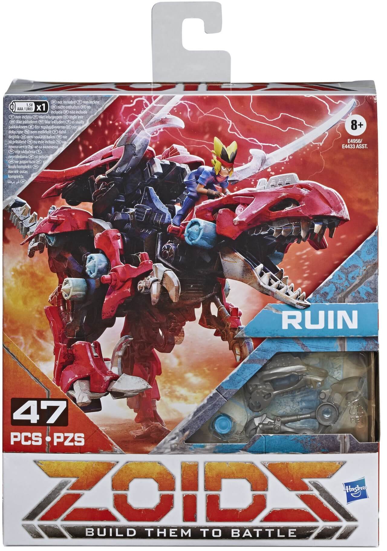 Includes 45 pieces to build Zoids Mega Battlers Ruin figure with attachable rider, battle mat, and instructions.